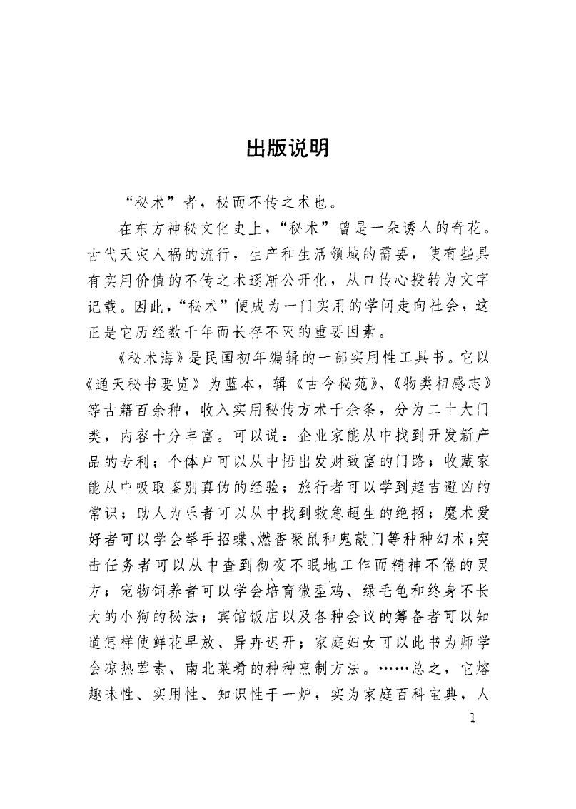 《秘术海》,全名《家庭宝鉴日用秘笈秘术海》,是以民国《通天秘书要览》为蓝本,辑《古今秘苑》、《物类相感志》等古籍百余种,收入实用秘传方术千余条,分为天地山川门、房屋建筑门等20大门类。 [1]